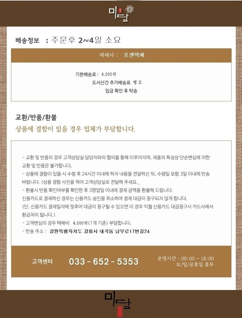 통신판매업 신고 : 제2019-강원강릉-0252호 | 연락처 : 033-652-5353 | FAX : 0504-237-2258 | 개인정보보호 책임자 : 최광희 | 대표자 : 전은숙